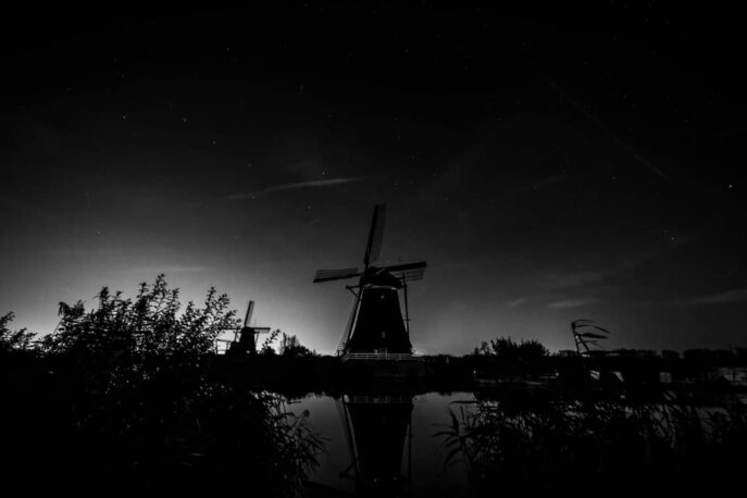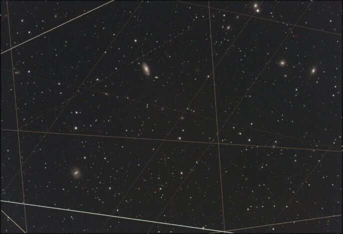 So sieht ein Blick in den Himmel aus, wenn 10 Minuten belichtet wird. Auf der Größe eines Fingernagels durchkreuzen 14 Satelliten und Flugzeuge das Bild.